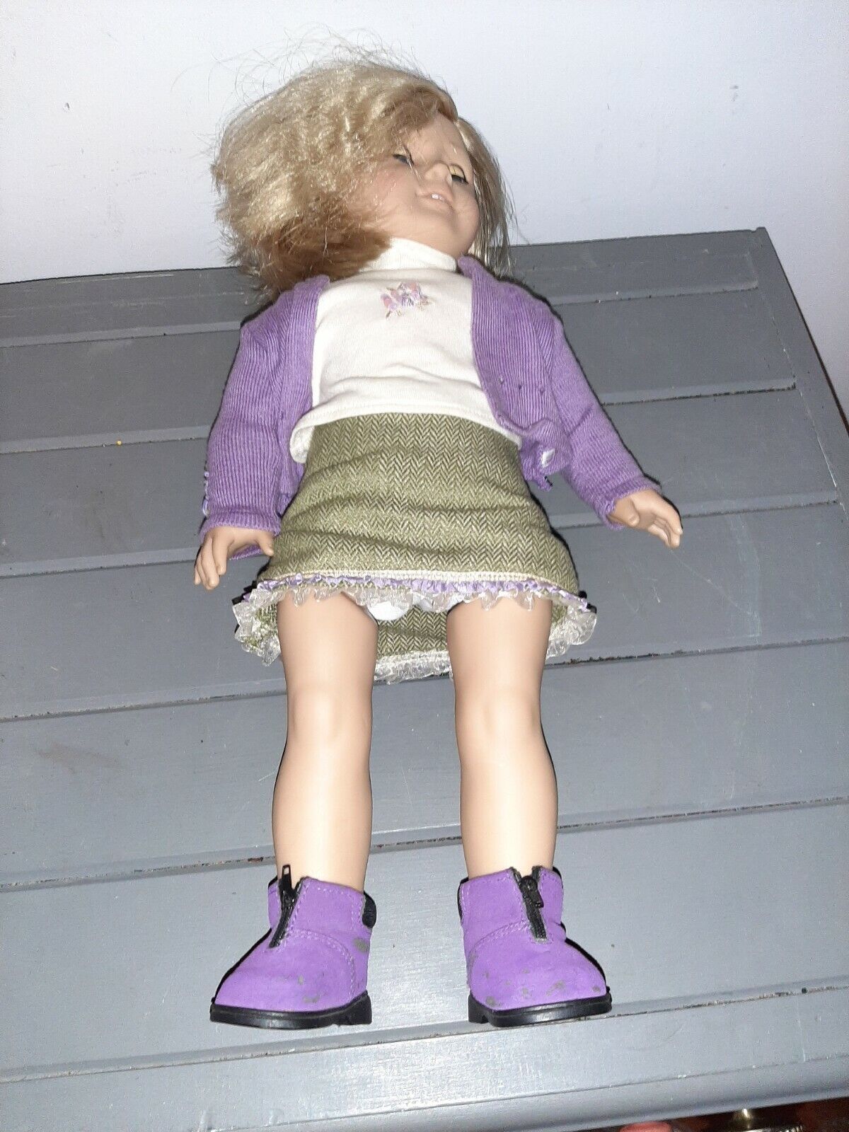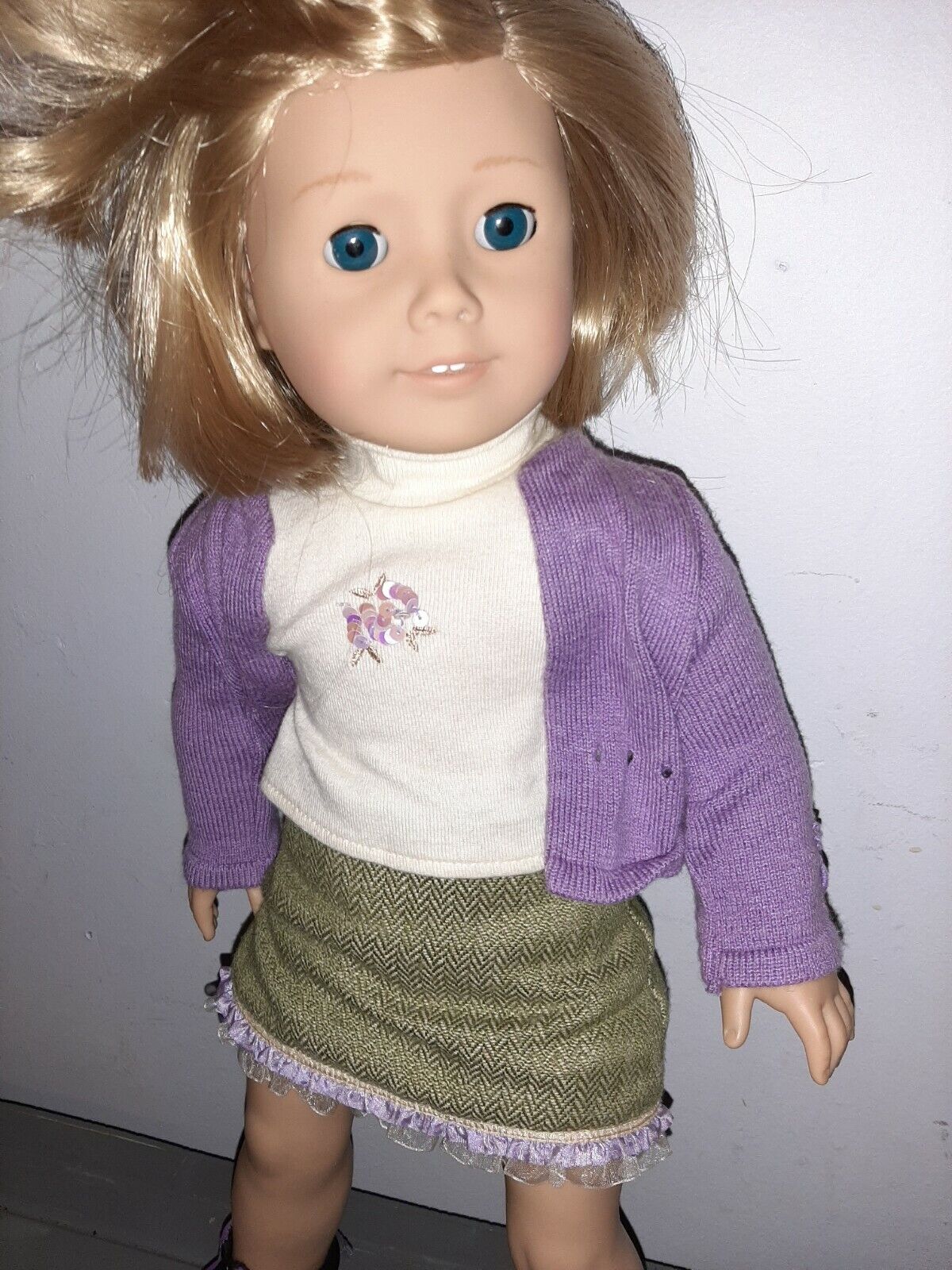 American Girl 18" Doll Blond Hair Blue Eyes. She is wearing a white shortsleeve mock neck with purple sequin embellishment under a purple long sleeve sweater. She has on white bloomers and a green skirt with purple and white trim. She has purple zip up boots.