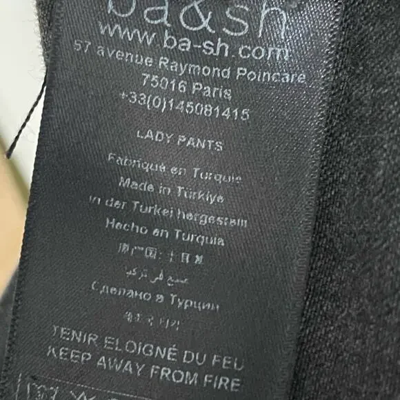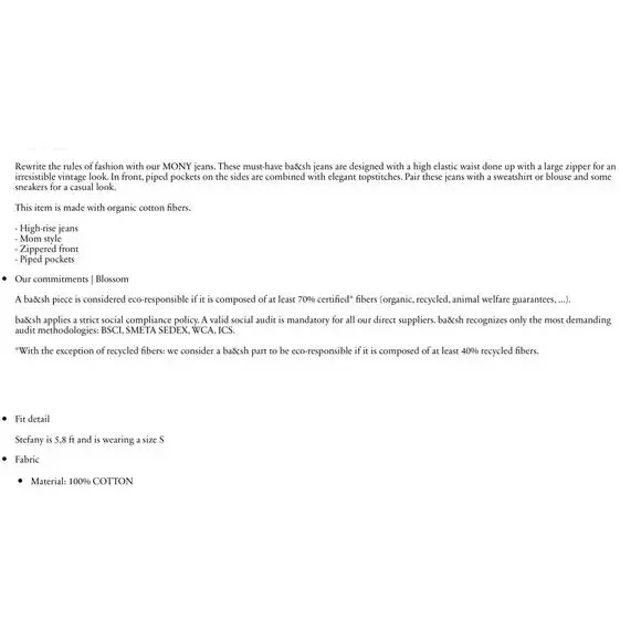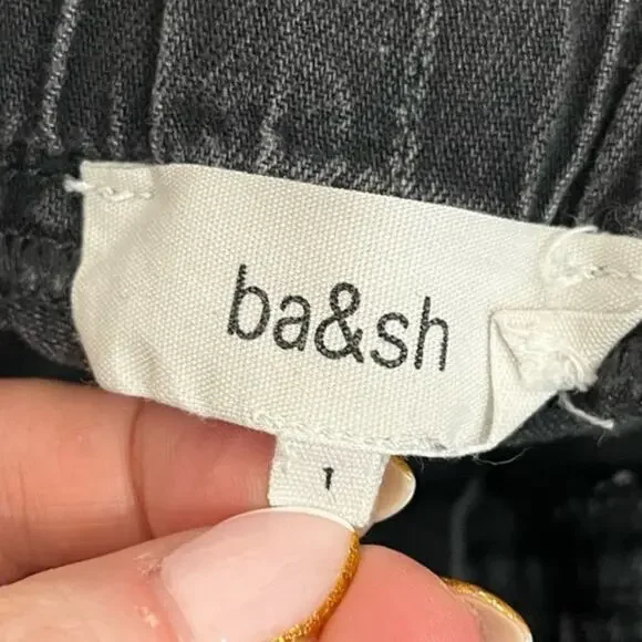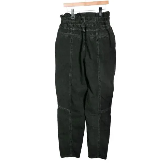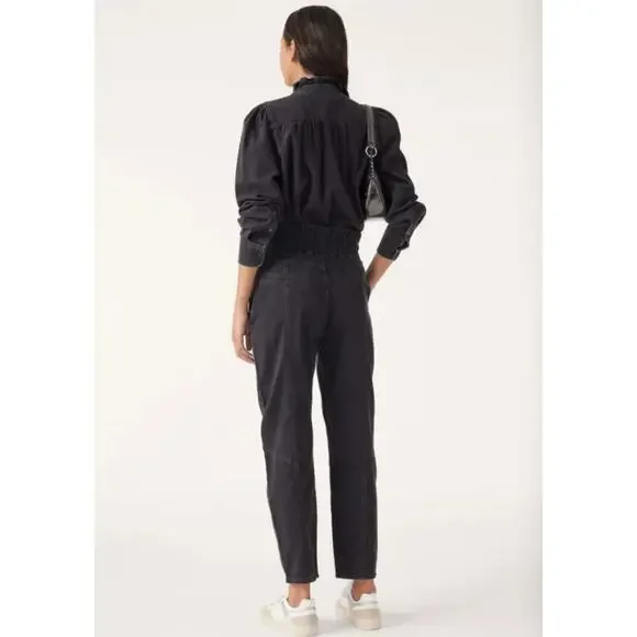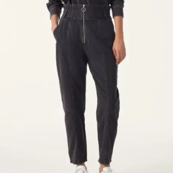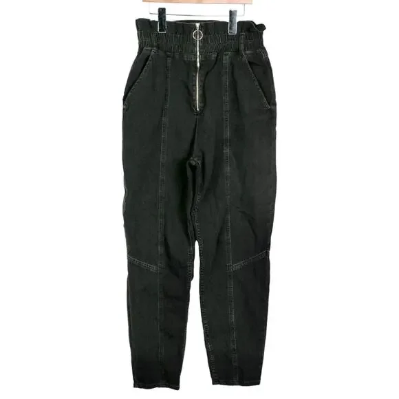Ba&sh Mony JeansSize 1 or US Small Excellent Preowned Condition High Waisted Silhouette with slightly tapered LegExposed zip front with elastic paperbag gathered waistSoft 100% Cotton, lightweight denimFront and back slash pocket Color is Noir a soft washed blackWaist 13 inches across laying flat stretches to 15 inches acrossHips 18 inches across Rise 14 inches Inseam 27 inches