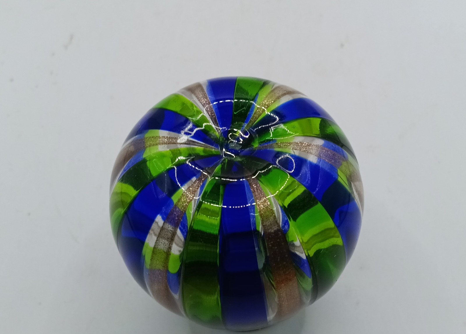This is a small, round Murano glass vase with vibrant vertical stripes of blue, green, and gold. The gold stripes appear to have a shimmering or aventurine effect within the glass. This type of vase is sometimes called a "kugelvase".