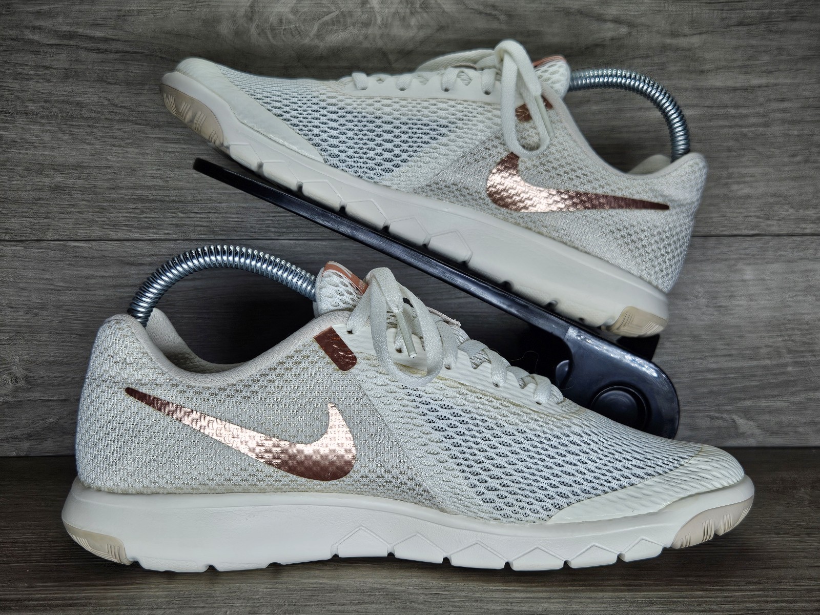 The Nike Flex RN 6 White Rose Gold 881805-102 Women's 8.5 sneaker is a stylish and versatile athletic shoe designed for various activities such as gym training, walking, and running. Featuring a lace-up closure, breathable mesh upper, cushioned foam insole, and lightweight rubber outsole, this sneaker offers comfort and performance for all-day wear. The white color with rose gold accents adds a touch of elegance to the overall design, making it suitable for casual or activewear occasions. With its standard shoe width and low-top shoe shaft style, this Nike Flex Experience RN 6 model is a fashionable and functional choice for women looking for a reliable sneaker for their active lifestyle. Please check all pictures for condition of the shoes. Professionally cleaned and sanitized. No box included.