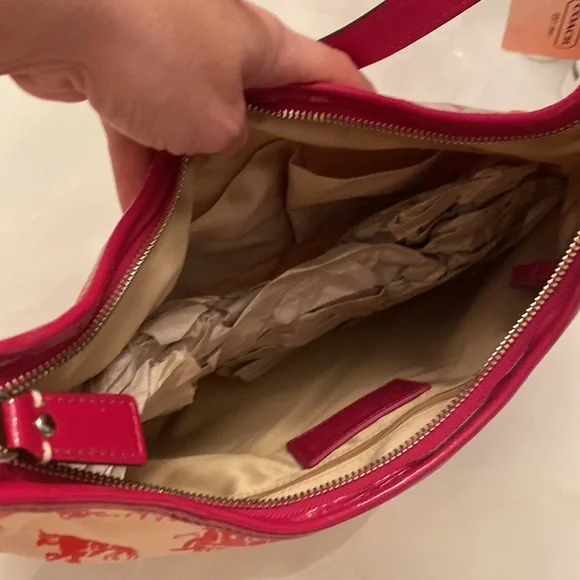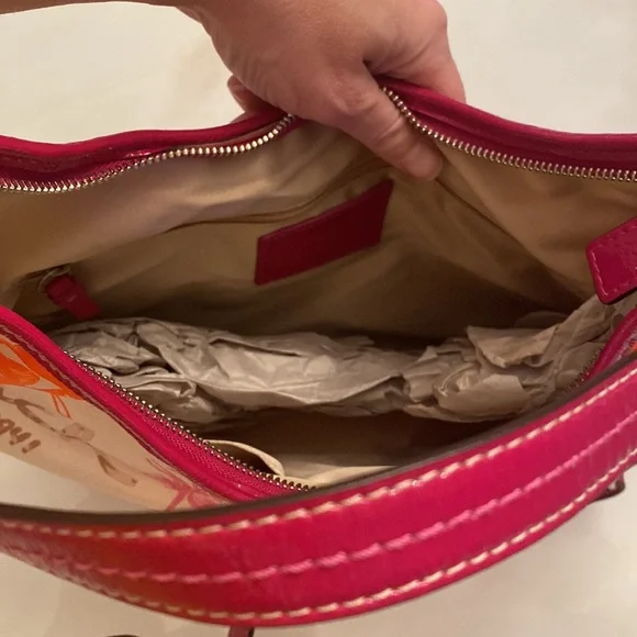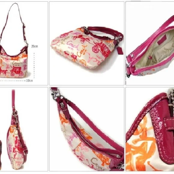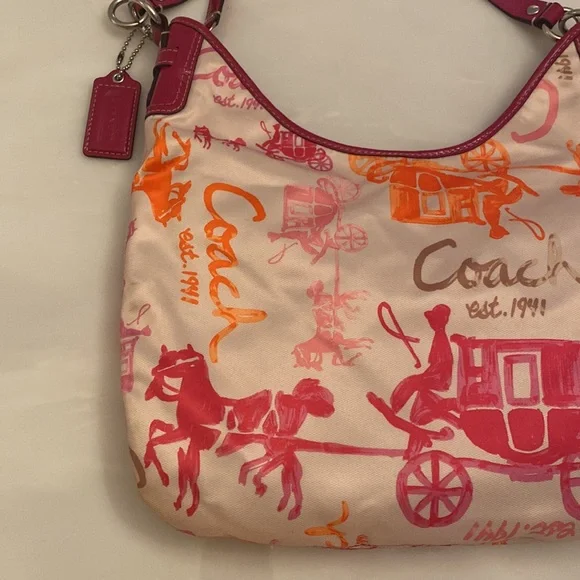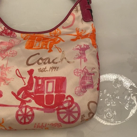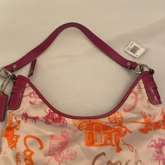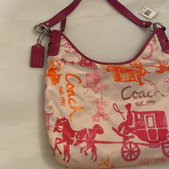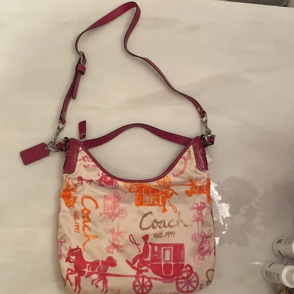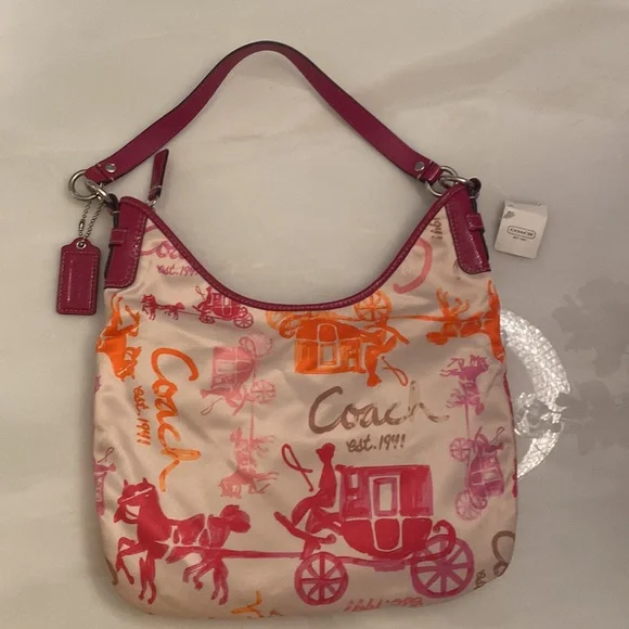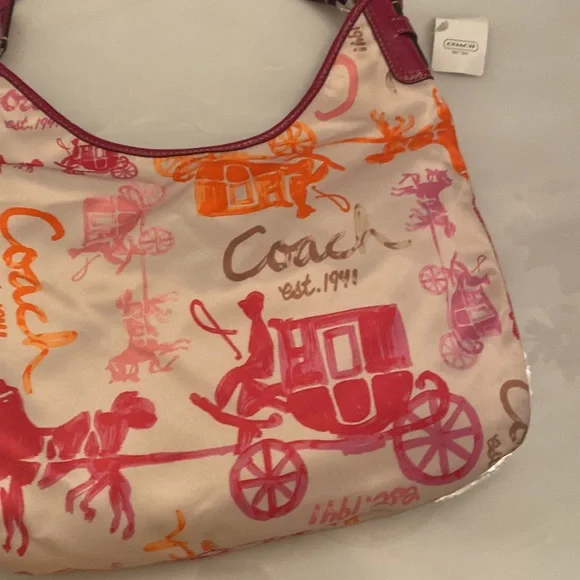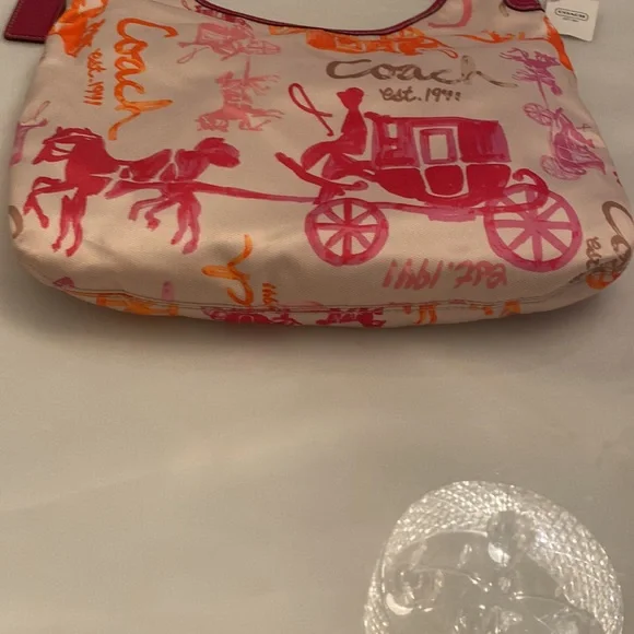 NWT Coach Multicolor Satin Leather Trim Horse and Carriage Crossbody Shoulder BagFeatures:* Material: leather, satin* Size: medium* Measurements (Lx Hx W): 13.5” x 9.5" x 3"* Silvers-tone hardware* Zip-top closure* Fabric lining inside* Inside zipper and open pockets* Leather handles with 11" drop* Crossbody strap with 20” drop