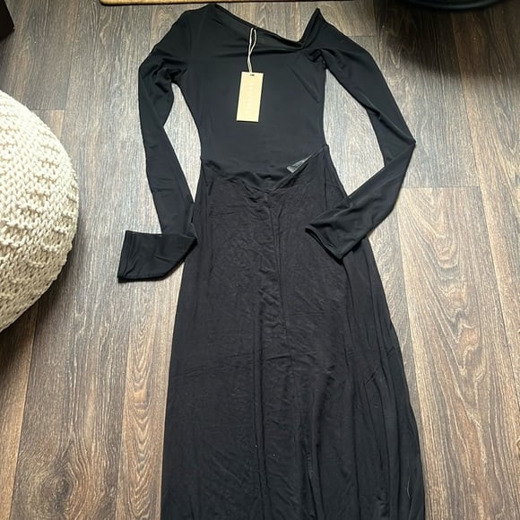 Asymmetrical neckline with a singular off shoulder sleeve
