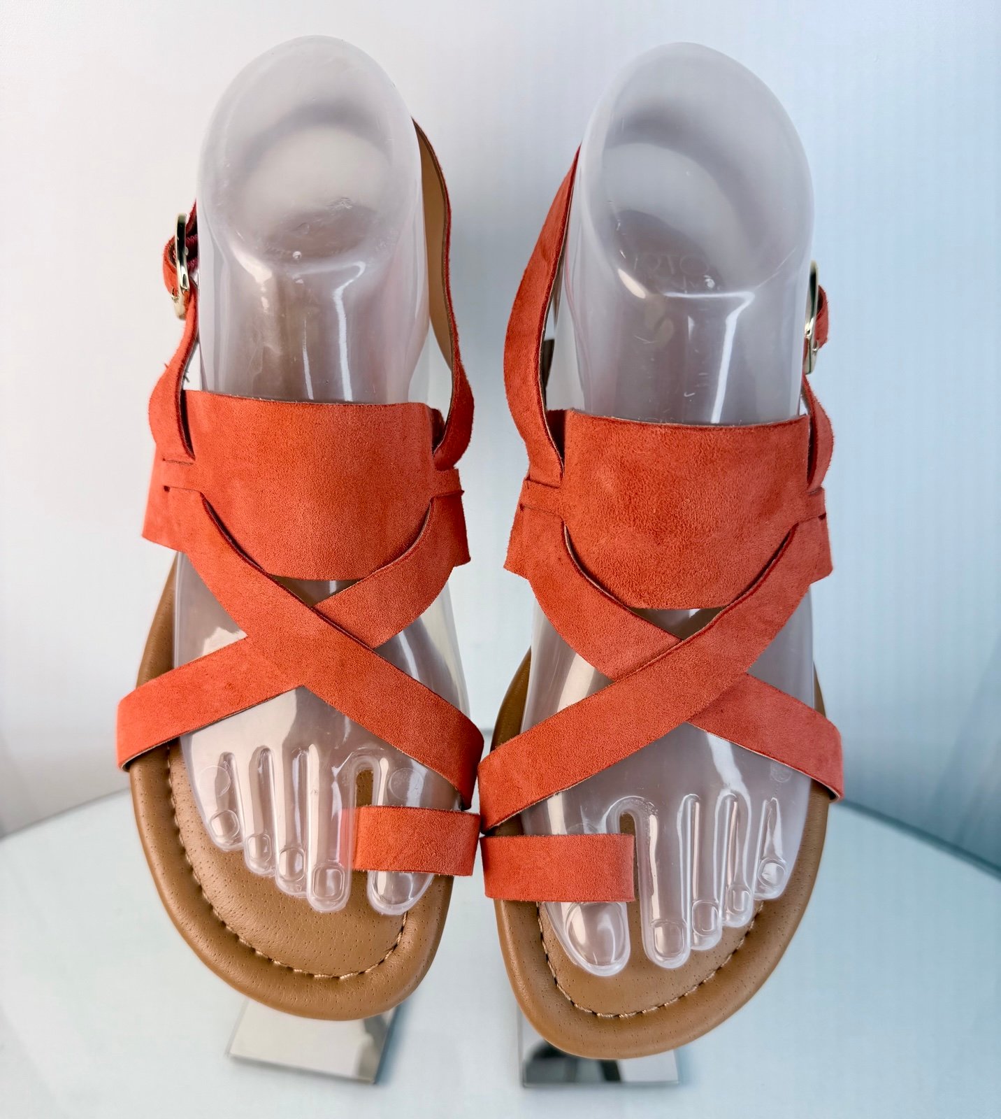 Size 7.5 Franco Sarto Gia Strappy Orange suede sandals with adjustable straps and buckle closure