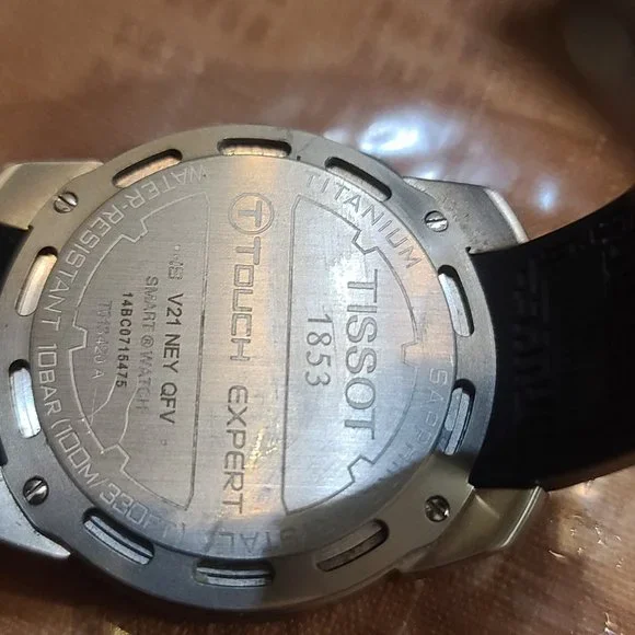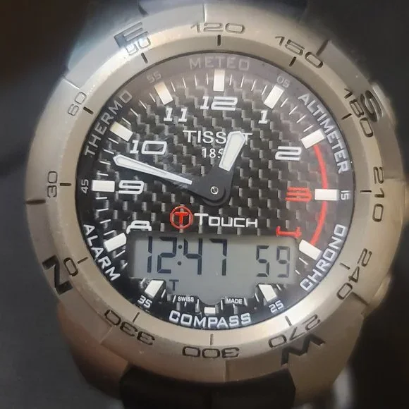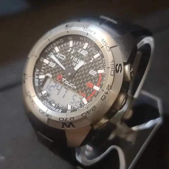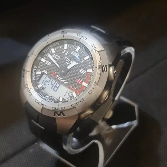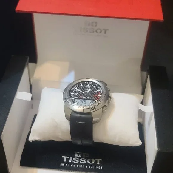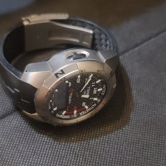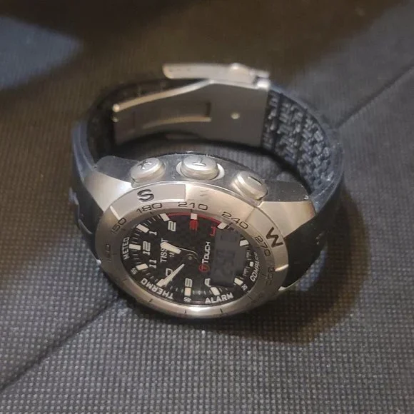 The latest generation of Touch Technology equips the core models of this collection which is highly demanded with some great high-tech equipment. Rubbing shoulders with professional sports instruments in terms of functionality, the Tissot T-Touch II combines stylish design with excellent performance. The compass and weather forecast function along with altimeter and a water resistance of up to a pressure of 10 bar (100 m / 330 ft) ensure that this watch is the right partner to accompany you on the journey of your choice, whether on a mountain top skiing through life or while witnessing the splendid ocean views. It enables modern adventurers to face the challenges of wild or urban territories. Cool details combinations enable wearers to make a range of style statements.Collection Touch CollectionWater resistance Water-resistant up to a pressure of 10 bar (100 m / 330 ft)Case options Rotating bezelCase Material Antimagnetic polished titanium caseLugs 21.10Case shape RoundCrystal Tactile scratch-resistant sapphire crystal with antireflective coatingMovement Swiss quartz tactileBand Black rubber with secure close claspCaliber 15 1/2'''Diameter (mm) 35Battery Battery type Renata CR 2032-NFunctions EOL (battery end-of-life indicator), Weather, Altimetre, Chrono, Compass, Thermo, 2 alarms,second t time zone and backlight functionsVery Good used condition new battery installed. shows very little wear.