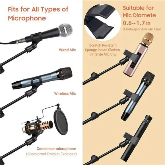 -Stable Tripod Base: CAHAYA tripod boom microphone tripod legs extends further than others which can stand holds microphone securely in place. Non-slip foot cover prevent it from moving around.-Carrying Bag & Universal Mic Clips: it comes with carrying bag and 2 mic clips: barrel style & clothespin style, fits for most types of microphones.-Stand Height Adjustable: microphone stand height can be adjusted from 25.2”/64cm to 62.2”/158cm, perfect floor use mic stand for stage performance, speeches, meeting rooms, party, wedding, karaoke sing or live broadcasts etc.-Extendable & Removable Boom Arm: boom arm extends freely within 16.9”-30.1” (43cm -76.5cm) and 360° angle rotatable through adjustment knobs which allows for easy positioning. Simply remove the boom arm and attach microphone clip to convert the mic stand into a traditional straight mic stand.-Portable and Easy to Assemble: all parts could be stored in a provided carrying bag for convenient transport.