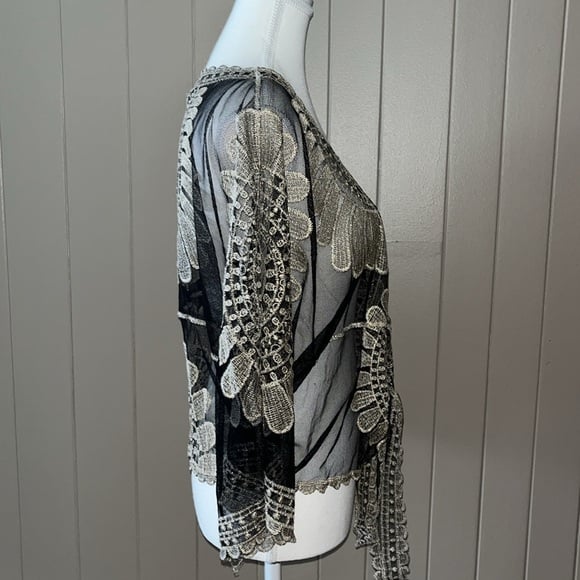 Make a bold and timeless statement with this stunning black cropped jacket, featuring intricate white lace embroidery in symmetrical floral and circular patterns.